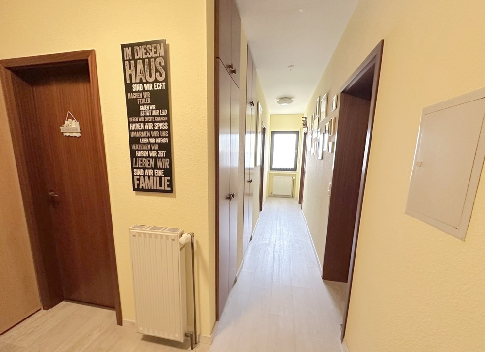 eine 3 Zimmer-Wohnung im Obergeschoss mit Diele, Gäste-WC, Wohnzimmer mit davorliegendem Balkon, Kinderzimmer, Schlafzimmer und Tageslichtbad mit Wanne und Dusche. Keller und Kfz-Stellplatz ist im Kaufpreis von 170.000,- € enthalten.Die genaue Aufteilung der Wohnungen entnehmen Sie den beigefügten Grundrissen.