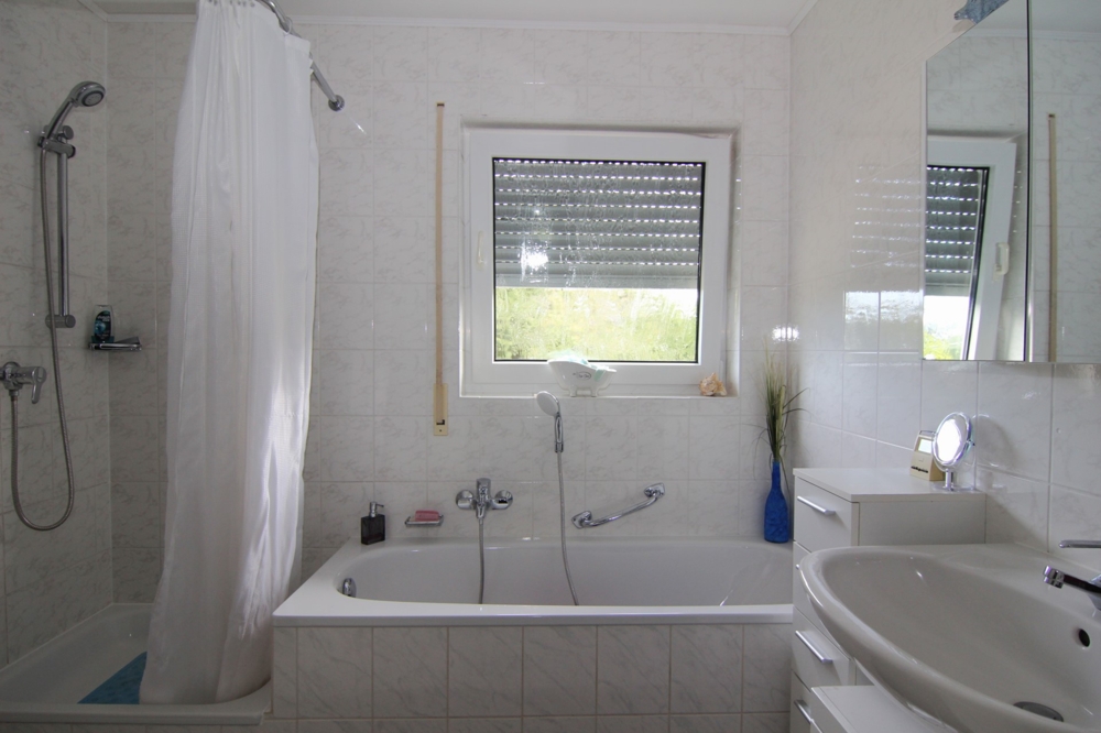 – Bad mit Fenster, Waschbecken, Wanne, Dusche und WC
